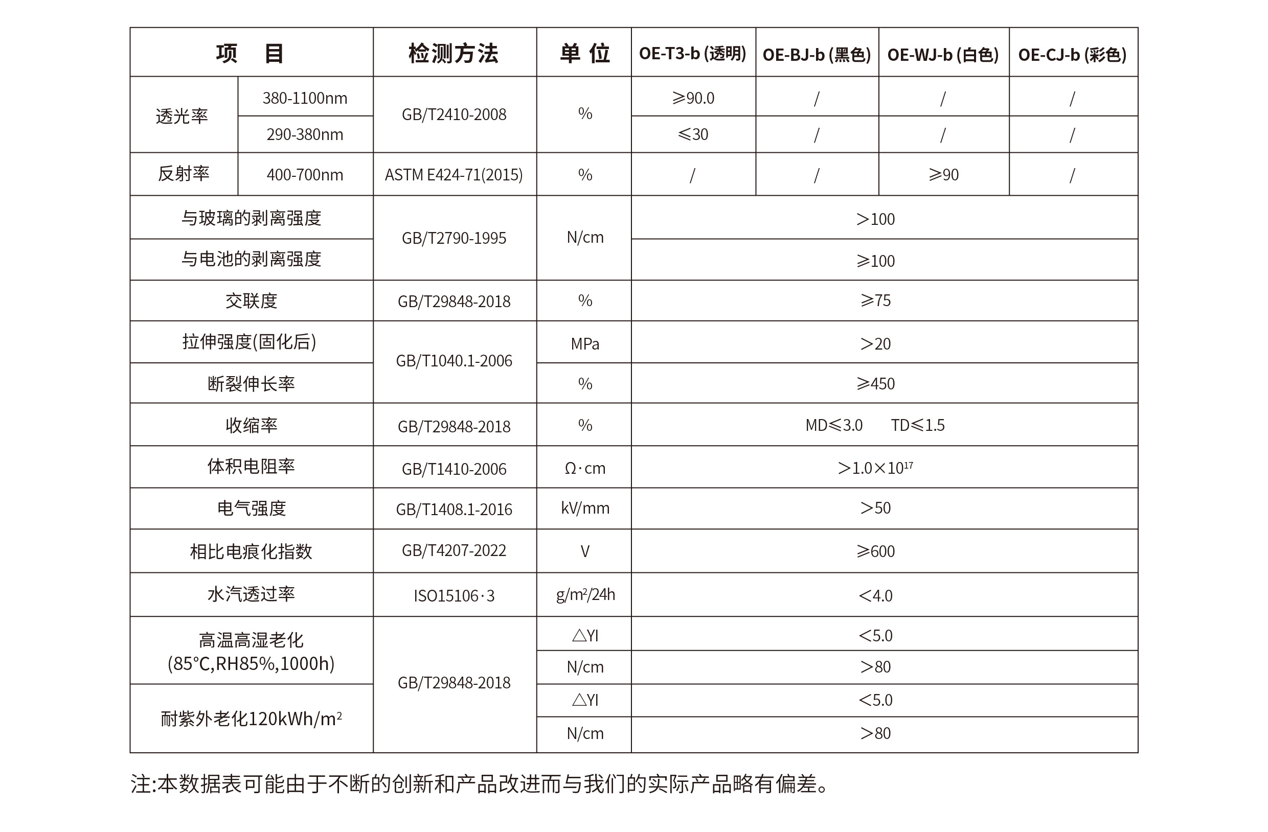 OE系列高强型EVA胶膜,是新一代抗酸型EVA封装胶膜,采用EVA为主要原料,通过特殊的分子链改性技术,大幅提高了EVA材料性能,该产品综合了POE与EVA材料的性能优点,既具有POE优异的抗PID性能,又具有EVA优异的粘接性和良好的层压性能,同时还具有较高的拉伸强度(>20MPa)和电气强度。产品已全面通过TUV认证。完全符合GB/T 29551-2023《建筑用太阳能光伏夹层玻璃》及T/CECS 1099-2022《玻璃结构工程技术规程》,在BIPV夹层玻璃应用上,其性能与生产成本都优于PVB、POE及普通EVA,有利于BIPV组件提质、降本、增效,是BIPV组件封装的理想方案。
