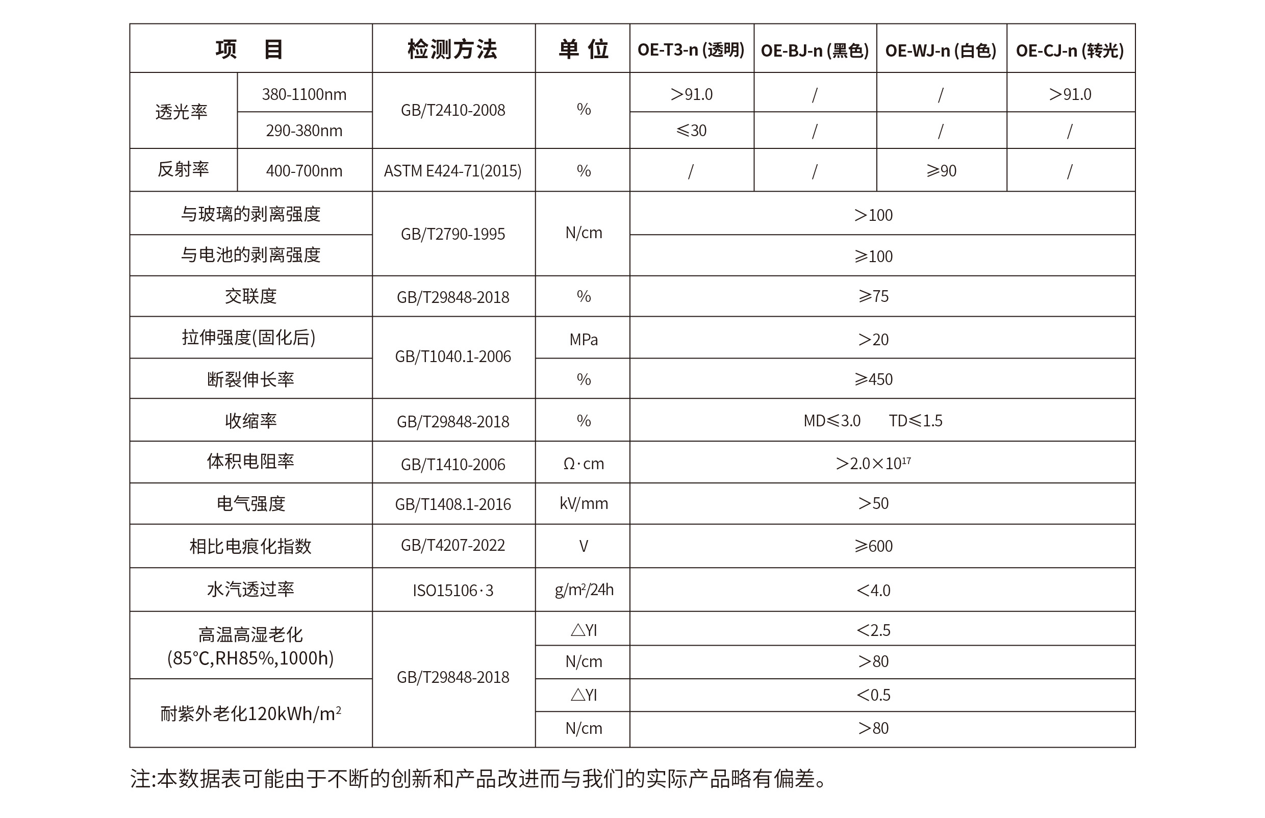 OE系列转光EVA胶膜,是新一代抗酸型EVA封装胶膜,采用EVA为主要原料,通过特殊的分子链改性技术,大幅提高了EVA材料性能,将紫外光转为蓝光的转换效率高达95%以上。该产品综合了POE与EVA材料的性能优点,其水汽透过率与体积电阻率优于POE,具有POE优异的抗PID性能,同时又具有EVA优异的粘接性和良好的层压性能(层压良率高),改性后的EVA胶膜,还具有较高的拉伸强度(>20Mpa),特别适用于HJT组件的封装